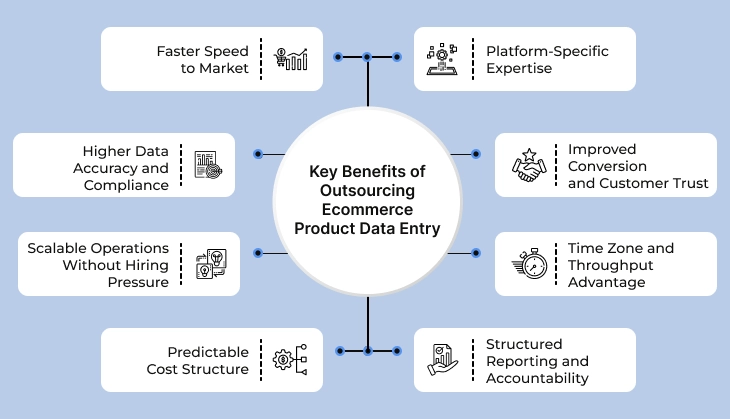 Enterprises outsource product data entry to stabilize catalog operations and scale seamlessly. Some of the top benefits that can be realized when the delivery is governed and measurable are: